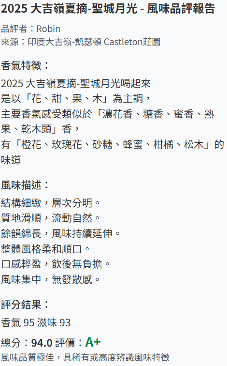 莊園名稱 凱瑟頓 Castleton | 批次與作品名 Moonlight /DJ-260 | 國際茶分級分類 FTGFOP1 | 採摘季節 夏摘 2nd Flush | 茶樹品種 AV2 | 產地位置 印度/大吉嶺 |